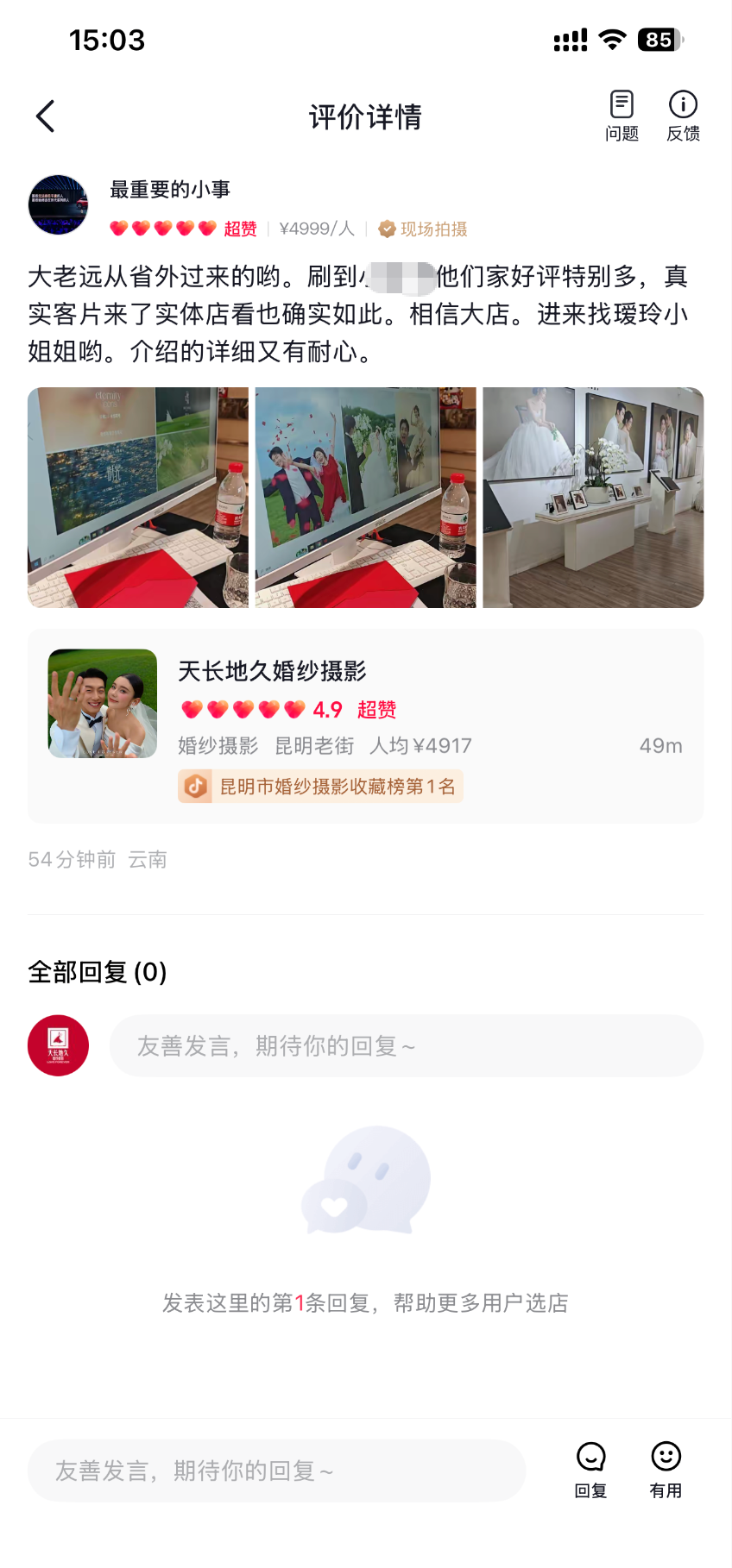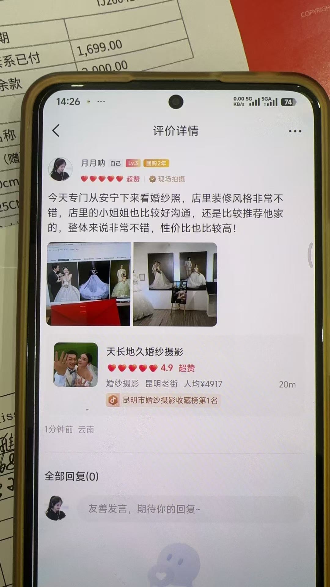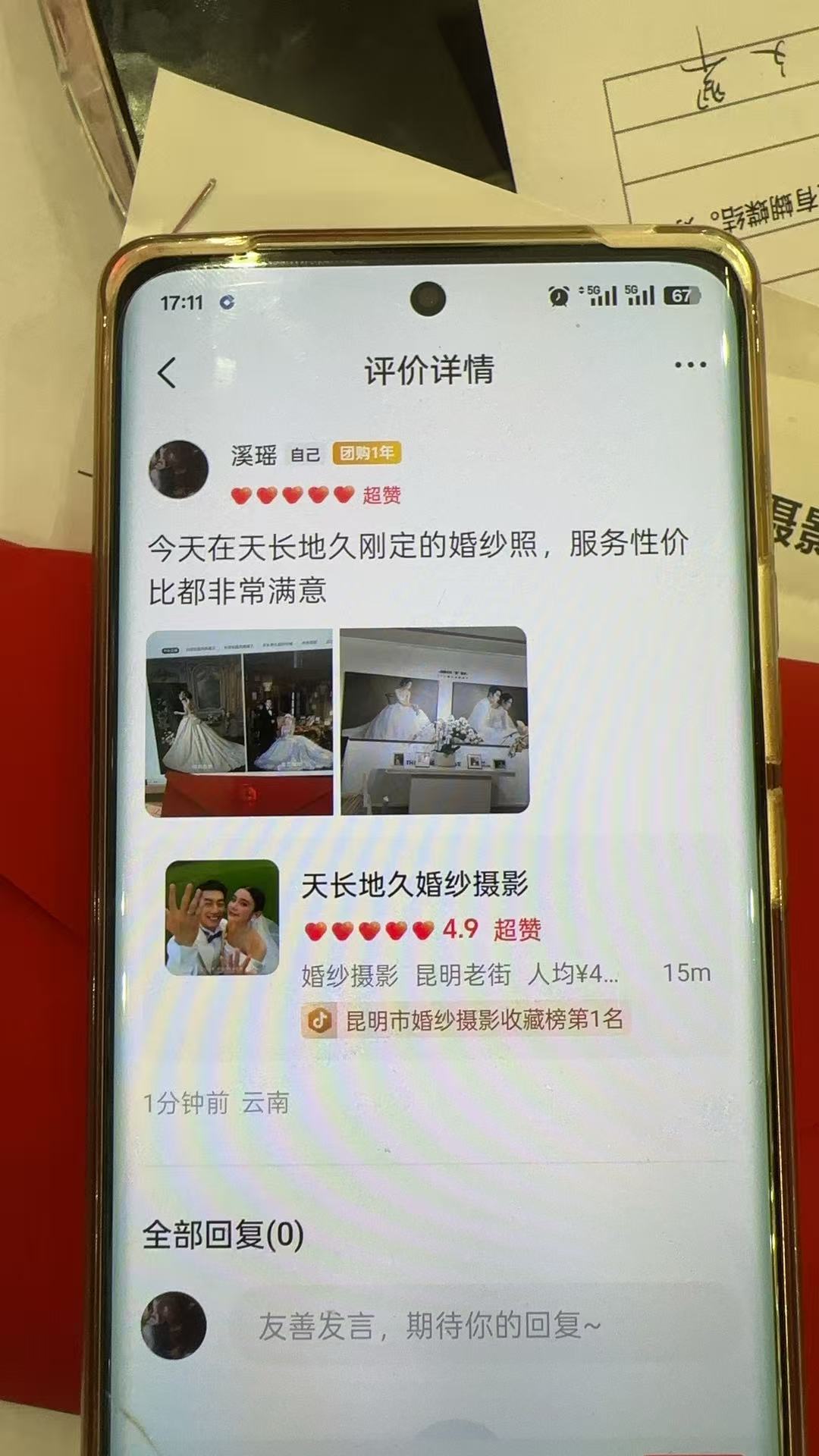 客人评价:今天在天长地久刚定的婚纱照,服务性价比都非常满意