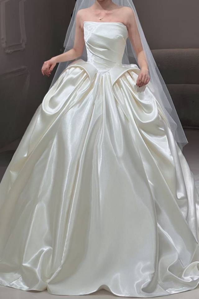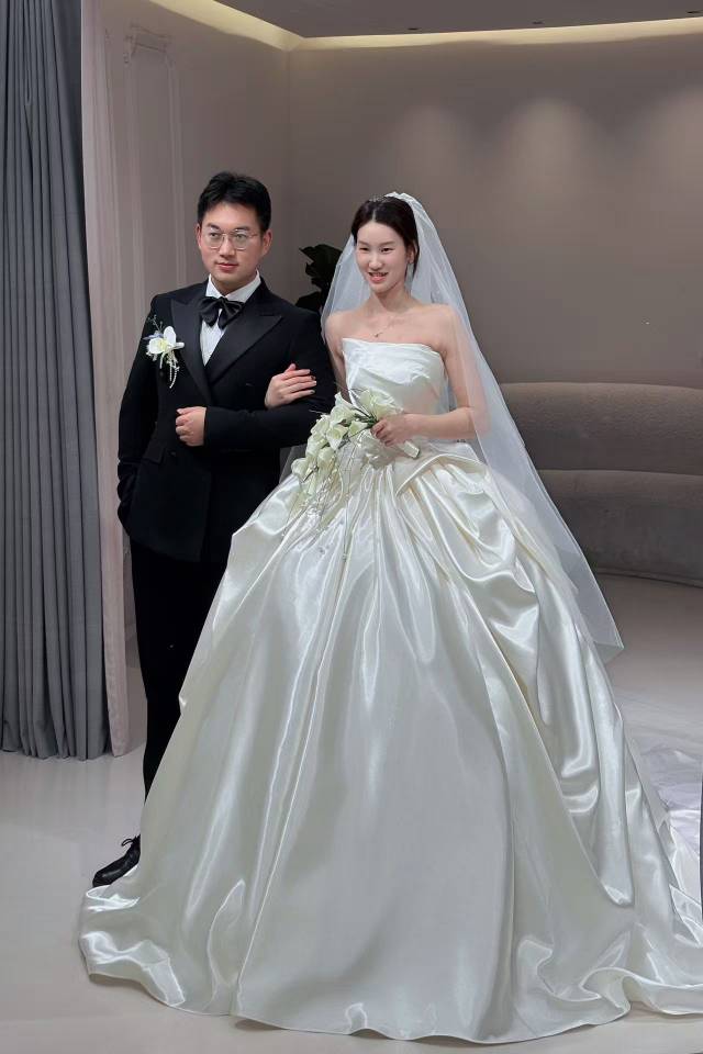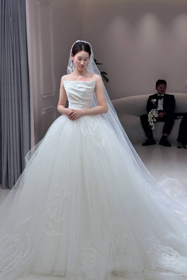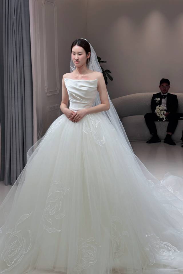 在洛·高定婚纱礼服馆里找到属于我的婚礼模样👰♀️ 在这家婚纱造型馆的试纱试妆体验,完全超出了我的期待! 关于婚纱:这款抹胸主纱太绝了!缎面的质感高级又细腻,上身的褶皱设计很显气质,大裙摆蓬度刚好,行走间自带公主气场,而且版型特别显瘦,把身材曲线衬得恰到好处。礼服师很有耐心,帮我搭配了头纱和手捧花,整个造型一出来,我瞬间就有了要结婚的实感。 关于妆容:化妆师的技术真的很在线!妆容是那种清透又精致的感觉,放大了我的优点,又很自然,不会有厚重的妆感。发型搭配的白色花饰和头纱,和婚纱风格特别搭,温柔又浪漫。 从进店的贴心接待,到试纱时的专业建议,再到试妆时的细致服务,强烈推荐给正在备婚的姐妹们,来这里试一次,你会和我一样,对自己的婚礼充满期待!