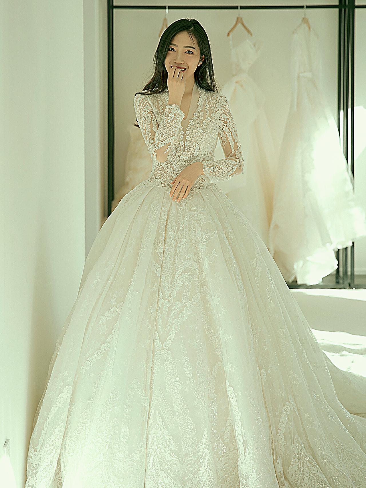 【梦中情纱】长袖V领齐地缎钻婚纱