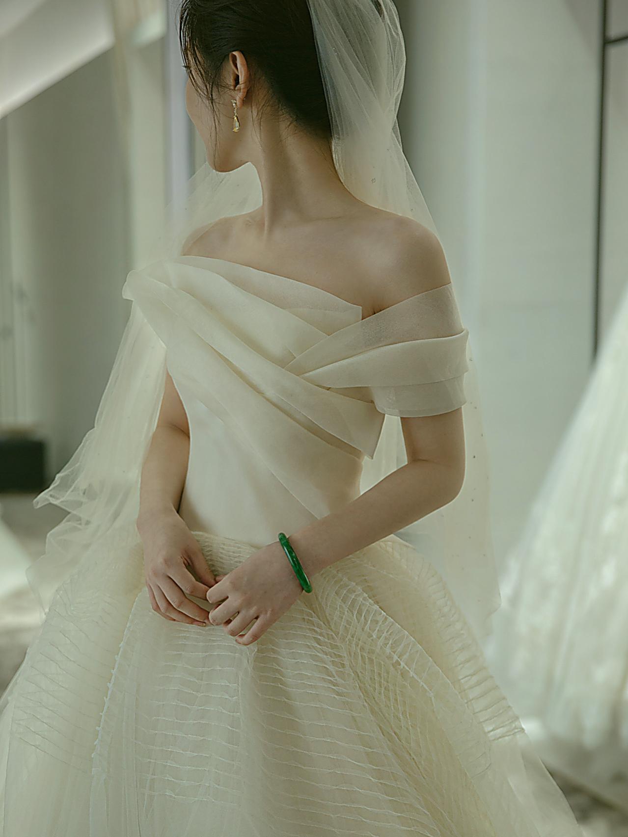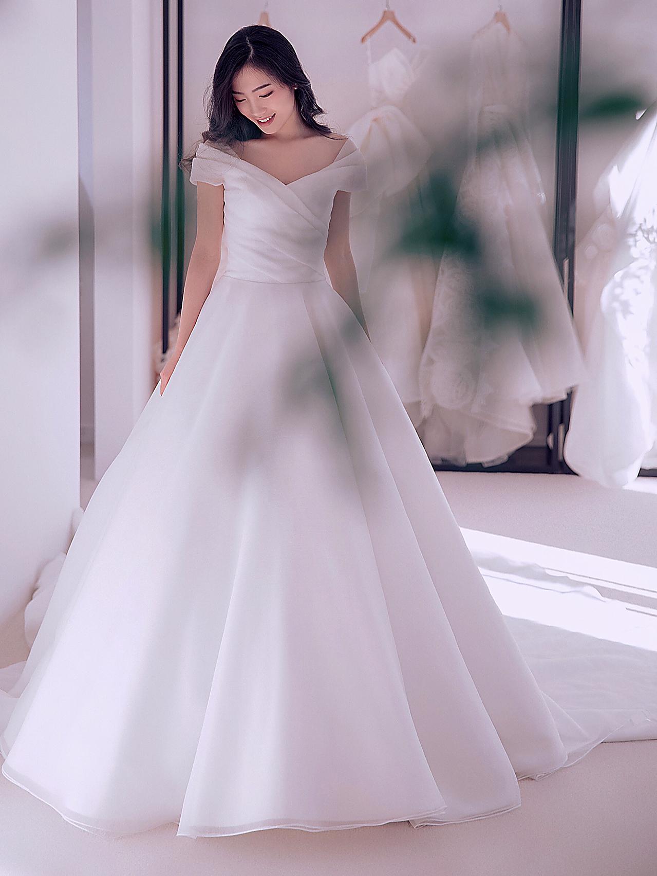 【优雅大气】一字肩缎面齐地婚纱