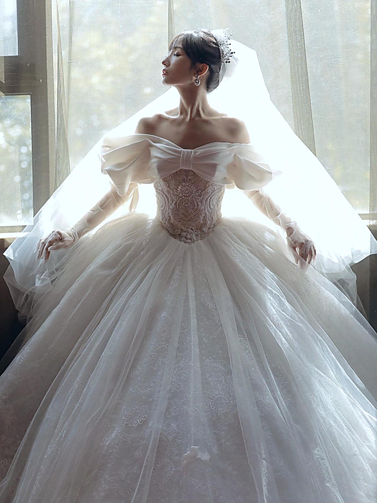 【重工新款】一字肩缎钻齐地婚纱